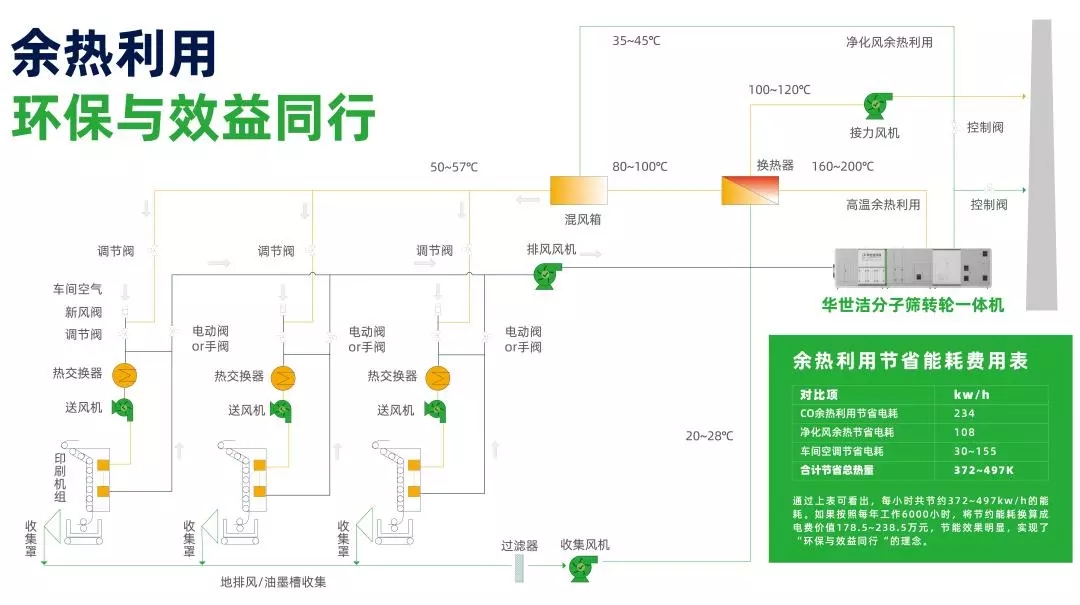 華世潔分子篩轉(zhuǎn)輪一體機(jī)采用先進(jìn)的“沸石轉(zhuǎn)輪吸附濃縮+催化氧化燃燒+余熱利用”的工藝。低溫條件下,大風(fēng)量的VOCs廢氣通過分子篩轉(zhuǎn)輪吸附后達(dá)標(biāo)排放。吸附有大量VOCs的轉(zhuǎn)輪旋轉(zhuǎn)進(jìn)入高溫脫附區(qū),形成小風(fēng)量的高濃度廢氣,送入后端的CO催化氧化系統(tǒng)進(jìn)行處理。CO凈化后的廢氣高溫的熱風(fēng)可通過換熱等方式進(jìn)行余熱利用。即開即用,減少無組織濃度揮發(fā),徹底降低溶劑殘留。