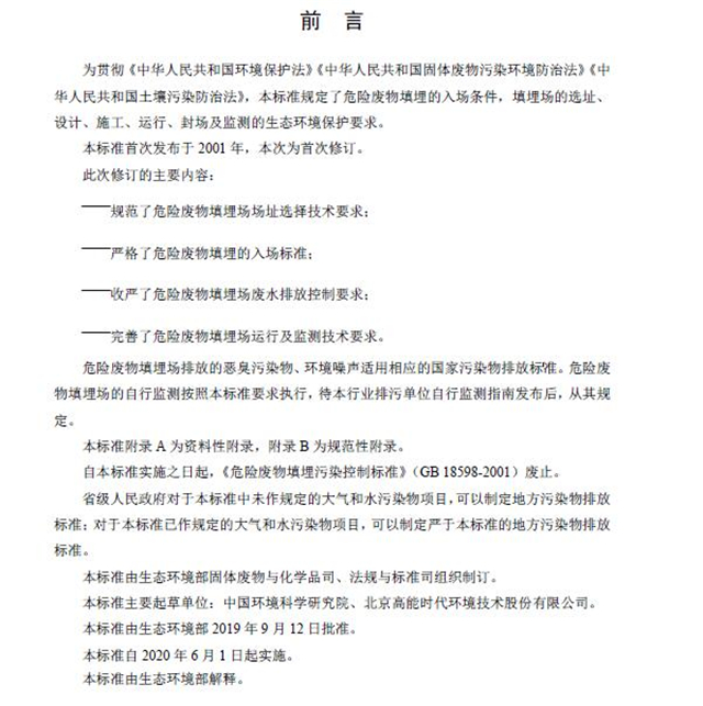 該標(biāo)準(zhǔn)自2020年6月1日起實(shí)施,自實(shí)施之日起,《危險(xiǎn)廢物填埋污染控制標(biāo)準(zhǔn)》(GB18598-2001)同時(shí)廢止。