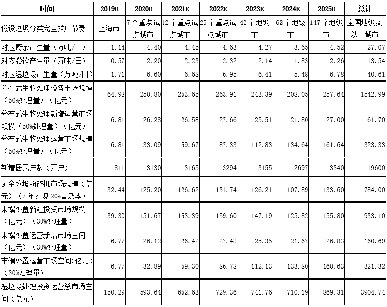 假設(shè)末端處置市場占據(jù)30%[2],前端處置市場占據(jù)70%(廚余垃圾粉碎機普及率20%[3],分布式生物設(shè)備占50%),廚余垃圾粉碎機單價2000元/臺、分布式生物設(shè)備單價38萬元/臺(0.5噸/天),推算全國地級及以上城市濕垃圾處理市場規(guī)模。經(jīng)過測算,2019-2025年我國地級及以上城市濕垃圾前端處理(廚余垃圾粉碎機和分布式生物處理設(shè)備)市場規(guī)模約為2650億元(設(shè)備+運營),年均市場規(guī)模約379億元;末端處置市場規(guī)模約1254億元(建設(shè)+收運+處理),年均市場規(guī)模約179億元。