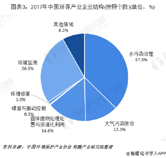 從領(lǐng)域分布看,環(huán)保產(chǎn)業(yè)主要覆蓋水污染防治、大氣污染防治、固體廢物處理處置與資源化、環(huán)境監(jiān)測4大細(xì)分領(lǐng)域,4領(lǐng)域集聚了約90%的環(huán)保企業(yè)。其中水污染治理占比37.3%,占比最大。