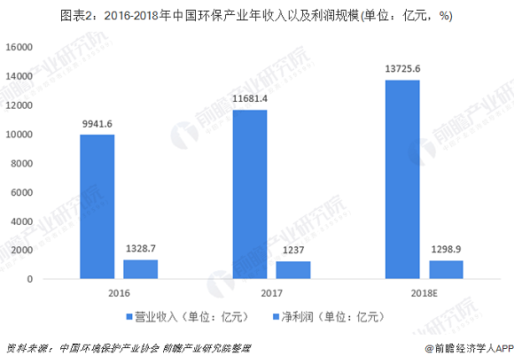 注:中國環(huán)境保護(hù)產(chǎn)業(yè)協(xié)會公布的《中國環(huán)保產(chǎn)業(yè)發(fā)展?fàn)顩r報告(2018)》發(fā)布時間為2019年2月,數(shù)據(jù)更新到2017年,2018年為前瞻根據(jù)產(chǎn)業(yè)狀況預(yù)測的數(shù)據(jù)。