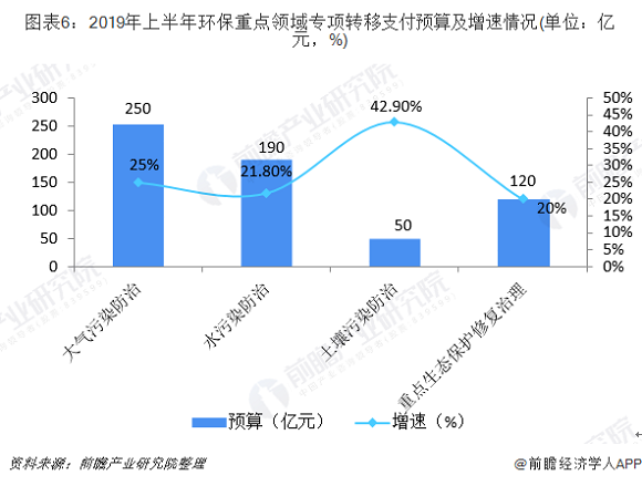同時,2019年環(huán)保重點(diǎn)領(lǐng)域?qū)m椶D(zhuǎn)移支付預(yù)算增速均高于20%。根據(jù)財政部《2019年中央對地方轉(zhuǎn)移支付預(yù)算表》,2019年大氣污染防治預(yù)算250億元,較同期實(shí)際數(shù)增長25.0%;水污染防治預(yù)算190億元,較同期實(shí)際數(shù)增長21.8%、土壤污染防治預(yù)算50億元,較同期實(shí)際數(shù)增長42.9%、重點(diǎn)生態(tài)保護(hù)修復(fù)治理預(yù)算120億元,較同期實(shí)際數(shù)增長20%。