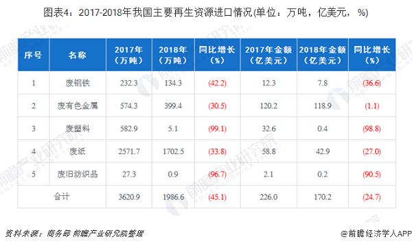 2018年,我國(guó)廢鋼鐵、廢有色金屬、廢塑料、廢紙、廢舊紡織品五大類(lèi)別的再生資源進(jìn)口總量1986.6萬(wàn)噸,同比下降45.1%。受到相關(guān)進(jìn)口政策調(diào)整的影響,五大類(lèi)別的再生資源進(jìn)口量均出現(xiàn)下滑,其中降幅最大的是廢塑料,同比下降99.1%。