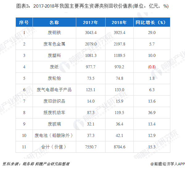2018年,我國(guó)十大品種再生資源回收總值為8704.6億元,同比增長(zhǎng)15.3%,除廢紙回收價(jià)值有所下降外,其余再生資源品種回收價(jià)值均有增長(zhǎng)。其中,報(bào)廢機(jī)動(dòng)車(chē)增幅最高,同比增長(zhǎng)36.9%;廢輪胎增幅相對(duì)最小,僅同比增長(zhǎng)1.8%。