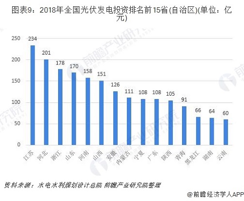2018年,光伏發(fā)電投資前十五位省(自治區(qū))投資總額達(dá)到1931億元,其中江蘇、河北光伏發(fā)電投資額均超過200億元。