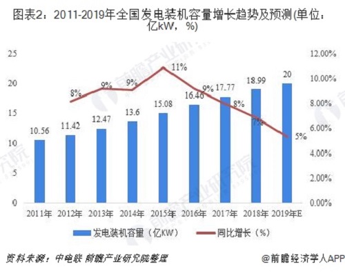 根據(jù)水電水利規(guī)劃設(shè)計總院發(fā)布的數(shù)據(jù):截止2018年年底,中國各類電源裝機(jī)容量189948萬kW,相比2017年增加11986萬kW,增長6.7%。中國主要可再生能源發(fā)電裝機(jī)容量72896kW,占全部電力裝機(jī)容量的38.4%。根據(jù)中電聯(lián)預(yù)測,截至2019年底,全國發(fā)電裝機(jī)容量20億千瓦左右,同比增長6%。