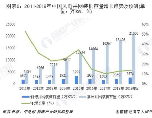 3、截止2019年年底,全國風(fēng)電累計并網(wǎng)裝機(jī)容量將達(dá)2.1億kW