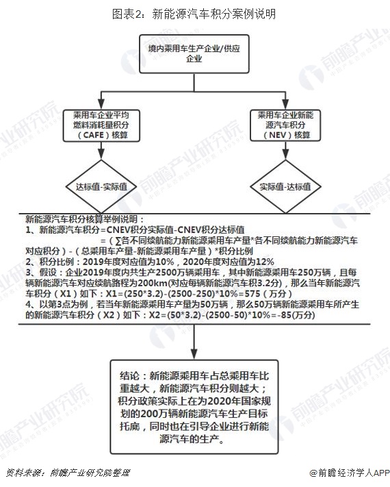 同樣,對政策進行充分研究后,前瞻認(rèn)為——新能源積分政策是引導(dǎo)傳統(tǒng)車企進行新能源汽車的生產(chǎn),因為在新能源汽車積分政策下,企業(yè)所生產(chǎn)的新能源乘用車數(shù)量越大,企業(yè)所能獲得的新能源汽車積分越多,反之,則出現(xiàn)負(fù)積分。以下以案例說明: