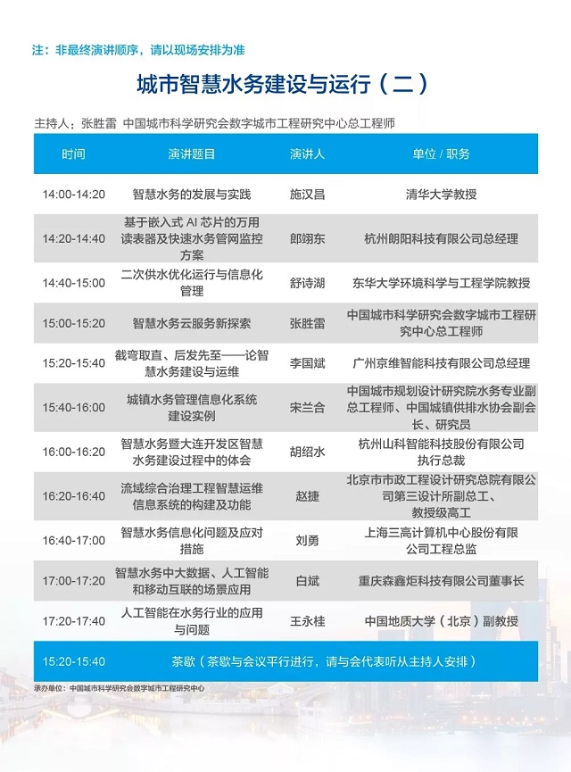 本次大會(huì)以推動(dòng)我國水資源的可持續(xù)利用、水行業(yè)的健康發(fā)展以及水生態(tài)文明的貫徹落實(shí)為使命,依托廣博深厚的學(xué)術(shù)網(wǎng)絡(luò),已邀請(qǐng)到多位國內(nèi)外院士、國家相關(guān)部委領(lǐng)導(dǎo)國際組織首席科學(xué)家、水環(huán)境治理和城鎮(zhèn)水務(wù)領(lǐng)域頂尖研究院所專家和領(lǐng)先企業(yè)負(fù)責(zé)人就當(dāng)前國家政策、 經(jīng)濟(jì)形勢(shì)、技術(shù)創(chuàng)新、產(chǎn)品提升、運(yùn)營管理、智慧平臺(tái)建設(shè)、大數(shù)據(jù)分析等城鎮(zhèn)水務(wù)與水環(huán)境治理前沿話題進(jìn)行學(xué)術(shù)探討交流。