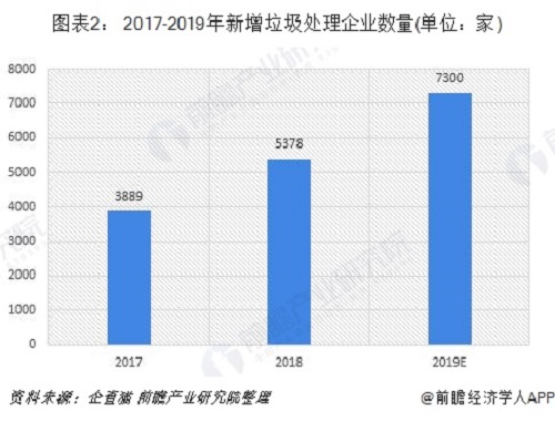 近年來,垃圾處理企業(yè)年增量逐年攀升:2017年、2018年新增垃圾處理企業(yè)分別為3889家和5378家,而截至11月18日,2019年新增該類企業(yè)已超過7300家,占總量的26.49%,平均每天就有約23家新企業(yè)出現(xiàn)。