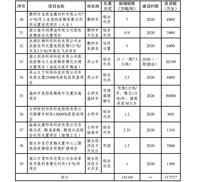 2019年-2020年,浙江省計劃新(擴)建100個危險廢物利用處置設(shè)施建設(shè)項目,總投資近99億元。