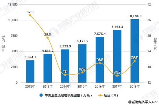 2012-2018年中國焚燒處理垃圾量統(tǒng)計及增長情況