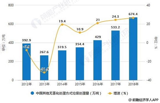 2012-2018年中國其他無害化處理方式垃圾處理量統(tǒng)計及增長情況