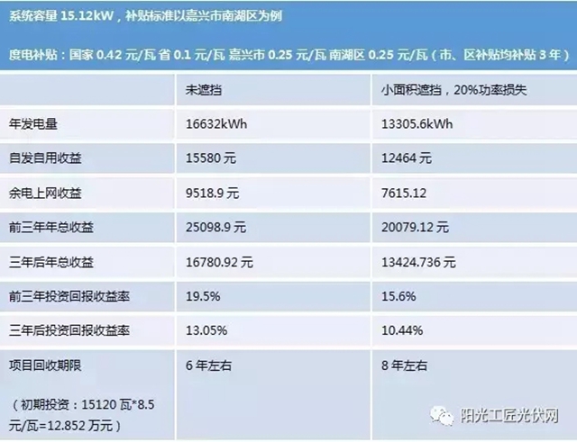 小小的陰影遮擋,給系統(tǒng)帶來了33.2%的功率損失。那么這對于投資收益的影響有多少呢?鑒于以上案例的實驗時間為當(dāng)年11月,且不同時間段的陰影遮擋面積不同,我們按照20%的功率損失進(jìn)行計算: