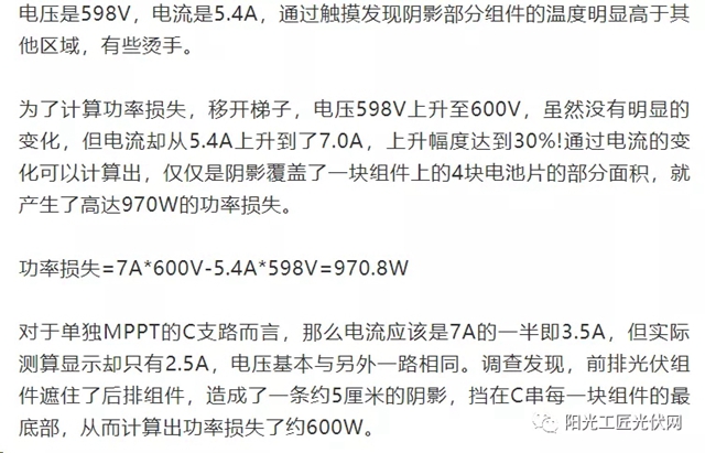 經(jīng)過勘探與計算得出該電站的功率因為兩處陰影導(dǎo)致?lián)p失高達(dá)1570W。除了功率損失之外,光伏系統(tǒng)中的陰影造成熱斑,長期如此,會加速組件老化,嚴(yán)重影響組件壽命。