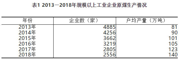 企業(yè)生產(chǎn)規(guī)模顯著擴大。2018年,有原煤生產(chǎn)的規(guī)模以上工業(yè)企業(yè)共計2556家,比2013年減少47.7%;戶均產(chǎn)量140萬噸,比2013年增加59萬噸,增長72.8%。其中,年產(chǎn)量90萬噸以下的小型原煤生產(chǎn)企業(yè)2237家,比2013年大幅減少2290家,產(chǎn)量占比14.4%,比2013年降低3.9個百分點。