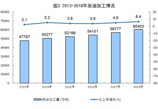 原油加工能力穩(wěn)步提升。2018年加工原油60403萬噸,位居世界第二,僅次于美國,比2013年增長26.4%,年均增長4.8%。生產(chǎn)成品油38230萬噸,比2013年增長18.7%,其中汽油、煤油和柴油產(chǎn)量分別增長42.0%、89.7%和0.5%,燃料油下降17.6%。