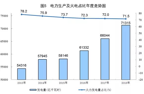 火電比重下降。2018年,火力發(fā)電量50963億千瓦時,比2013年增長20.0%,遠低于清潔能源發(fā)電71.8%的增速?;鹆Πl(fā)電占比71.5%,比2013年下降6.7個百分點,電力生產(chǎn)清潔低碳化趨勢明顯。分地區(qū)看,山東、江蘇、內(nèi)蒙古和廣東火力發(fā)電量分列前四位,2018年分別為5525、4578、4164和3468億千瓦時,合計占全國的34.8%。