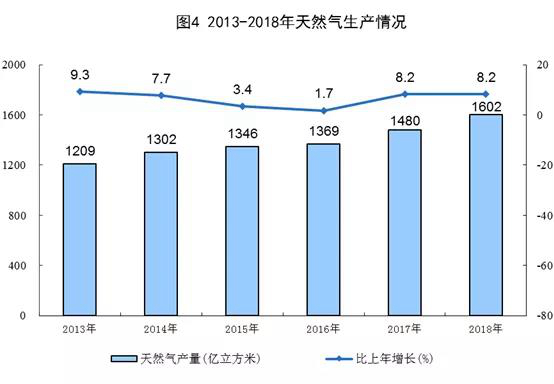 天然氣連續(xù)兩年增產(chǎn)超百億立方米。2018年,天然氣產(chǎn)量1602億立方米,比上年增產(chǎn)122億立方米,常規(guī)天然氣和非常規(guī)天然氣分別增產(chǎn)94億立方米和28億立方米。與2013年比,天然氣產(chǎn)量增長37.5%,年均增長6.6%。