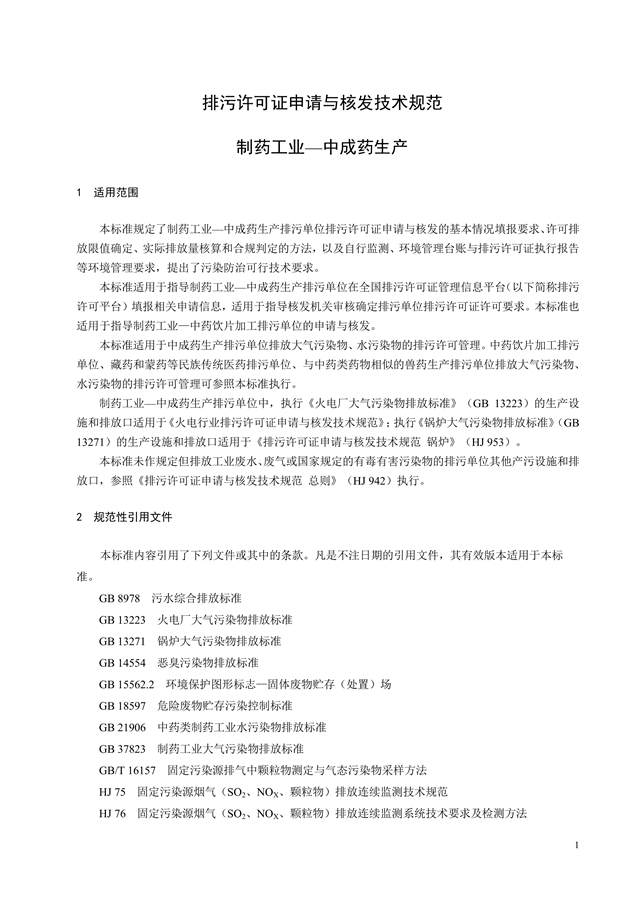 貫徹落實(shí)《中華人民共和國環(huán)境保護(hù)法》《中華人民共和國大氣污染防治法》《中華人民共和國水污染防治法》《中華人民共和國土壤污染防治法》等法律法規(guī)、《國務(wù)院辦公廳關(guān)于印發(fā)控制污染物排放許可制實(shí)施方案的通知》(國辦發(fā)﹝2016﹞81號)和《排放許可管理辦法(試行)》(環(huán)境保護(hù)部令第 48 號),完善排污許可技術(shù)支撐體系,指導(dǎo)和規(guī)范制藥工業(yè)—中成藥生產(chǎn)排污單位排污許可證申請與核發(fā)工作,制定本標(biāo)準(zhǔn)。