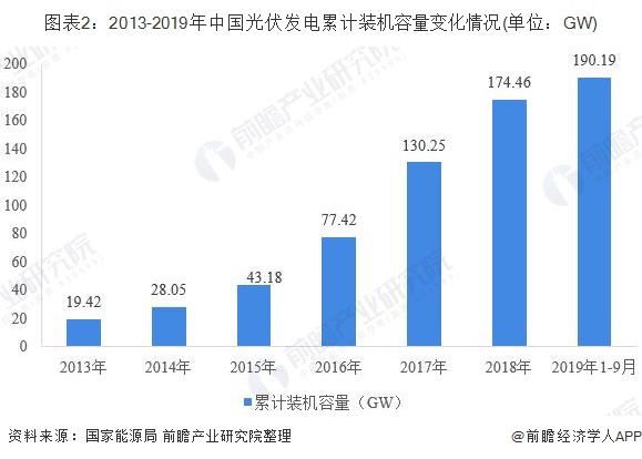 累計(jì)裝機(jī)容量方面,據(jù)國家能源局統(tǒng)計(jì)數(shù)據(jù)顯示,2013年以來,我國光伏發(fā)電累計(jì)裝機(jī)容量增長迅速。2013年,全國光伏發(fā)電累計(jì)裝機(jī)容量僅為19.42GW,到2018年已經(jīng)增長至174.46GW。預(yù)計(jì)2013-2019年,全國光伏發(fā)電累計(jì)裝機(jī)容量將有近10倍增長。截至2019年9月底,全國光伏發(fā)電累計(jì)裝機(jī)190.19GW,同比增長15%。