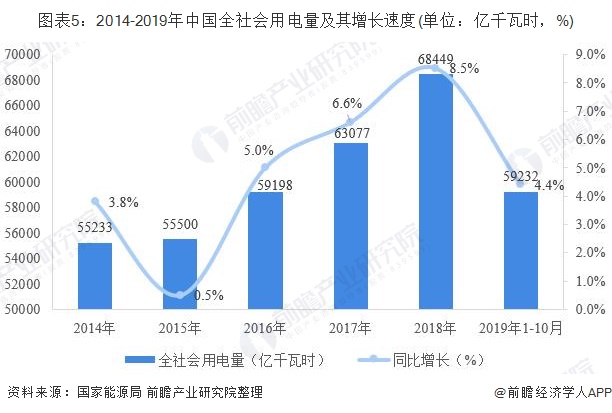 我國作為電力生產(chǎn)大國,同時(shí)也是電力消耗大國,近年來,我國全社會(huì)用電量持續(xù)提升。根據(jù)國家能源局發(fā)布2018年全社會(huì)用電量等數(shù)據(jù)顯示,2018年,全社會(huì)用電量68449億千瓦時(shí),同比增長8.5%。創(chuàng)2014年以來增速新高。