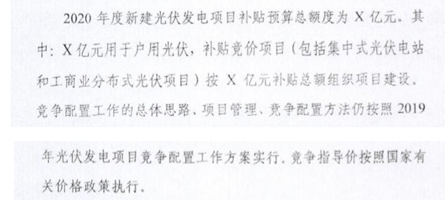 《通知》的一大亮點(diǎn)就是“2020年度新建光伏發(fā)電項(xiàng)目補(bǔ)貼預(yù)算總額度為X億元,其中戶用光伏X億元,競價(jià)項(xiàng)目X億元”,這是因?yàn)樨?cái)政部、國家發(fā)改委價(jià)格司仍未確定2020年光伏補(bǔ)貼總額度以及指導(dǎo)電價(jià),因此負(fù)責(zé)制定管理辦法的國家能源局也無法給出明確數(shù)額,指導(dǎo)價(jià)也處于待定狀態(tài)。