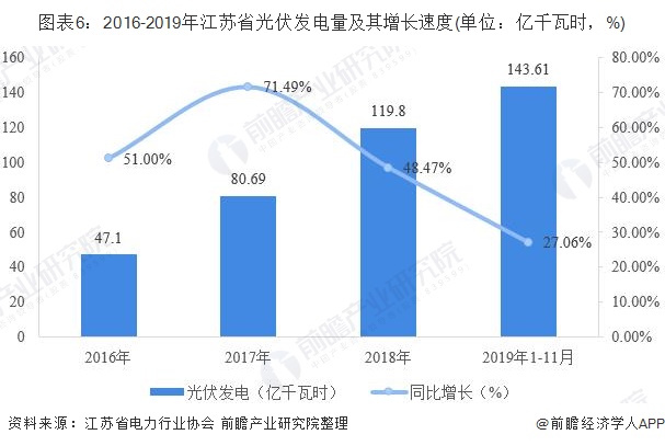 光伏發(fā)電方面,2016-2019年,江蘇省風電發(fā)電量高速增長,2016年全省風電發(fā)電量僅47.1億千瓦時,到2018年增長至119.8億千瓦時。截至2019年11月,全省風電發(fā)電量為143.61億千瓦時,同比增長27.06%,與風電發(fā)電量之間的差距進一步縮小。