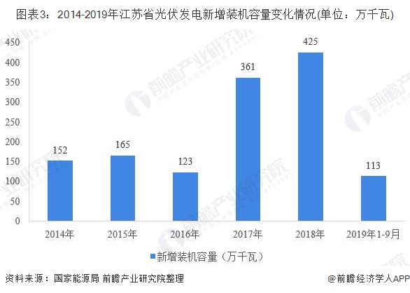 江蘇省作為我國經濟強省,也是能源發(fā)展大省,在可再生能源發(fā)展方面處于我國前列,光伏發(fā)電領域更是位居前三,截至2019年第三季度,江蘇省光伏累計裝機容量為1445萬千瓦,僅次于山東省,排名全國第二。