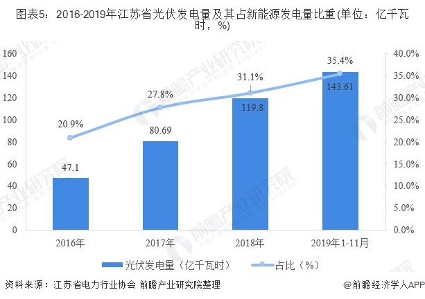 據江蘇省電力行業(yè)協會統(tǒng)計數據顯示,2016年以來,江蘇省光伏發(fā)電量穩(wěn)步增長,2016年,全省光伏發(fā)電量僅為47.1億千瓦時,到2019年1-11月,已增長至143.61億千瓦時。另外,光伏發(fā)電在江蘇省新能源發(fā)電中的市場份額也在逐步提升,2019年1-11月,江蘇省光伏發(fā)電量占新能源發(fā)電量的比重已提升至35.4%。