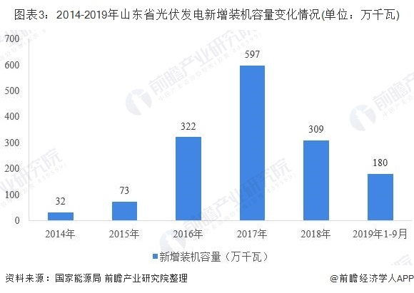 2014年以來,隨著國家光伏發(fā)電由西向東發(fā)展戰(zhàn)略的推進(jìn),山東省光伏發(fā)電呈現(xiàn)出爆發(fā)式增長。據(jù)國家能源局統(tǒng)計(jì)數(shù)據(jù)顯示,2014年,山東省累計(jì)裝機(jī)容量僅60萬千瓦,到2017年,全省光伏發(fā)電累計(jì)裝機(jī)容量突破1000萬千瓦,達(dá)到1052萬千瓦。截至2019年第三季度,山東省光伏發(fā)電累計(jì)裝機(jī)容量已達(dá)到1541萬千瓦,排名靠前。
