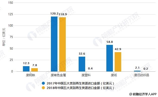 2017-2018年中國(guó)五大類別再生資源進(jìn)口金額統(tǒng)計(jì)情況