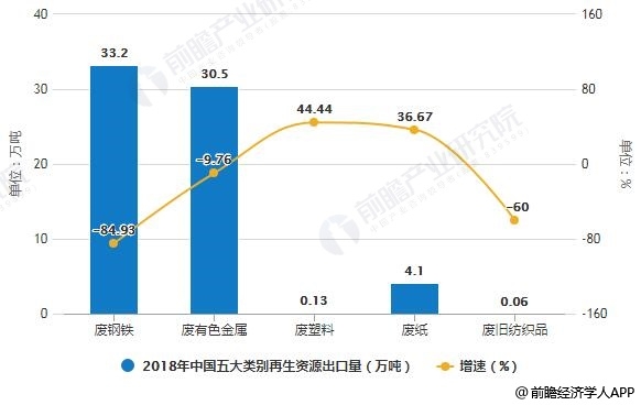 2018年中國(guó)五大類別再生資源出口量統(tǒng)計(jì)及增長(zhǎng)情況