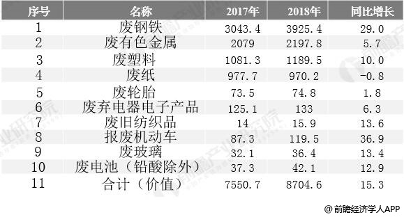 2017-2018年中國(guó)再生資源主要類別回收價(jià)值統(tǒng)計(jì)及增長(zhǎng)情況