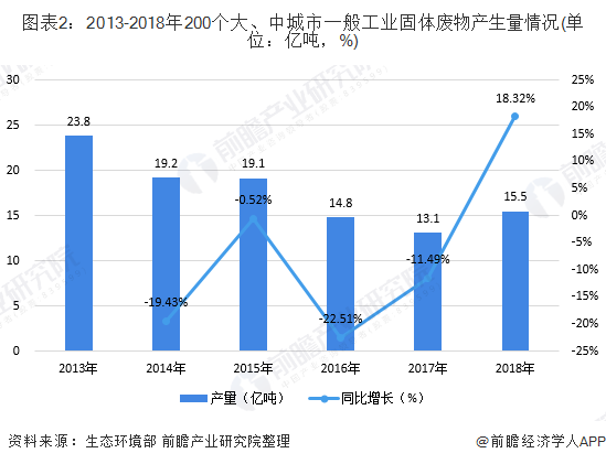 根據(jù)生態(tài)環(huán)境部發(fā)布的《2019年全國大、中城市固體廢物污染環(huán)境防治年報》,2018年,200個大、中城市一般工業(yè)固體廢物產(chǎn)生量達15.5億噸,較2017年產(chǎn)量同比增長18.32%。