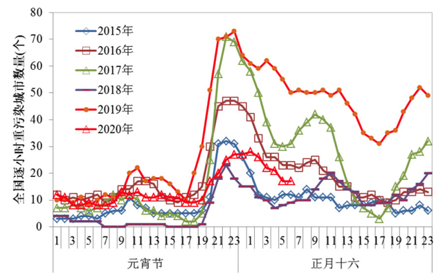 圖3近六年元宵節(jié)期間全國逐小時(shí)重污染城市數(shù)量