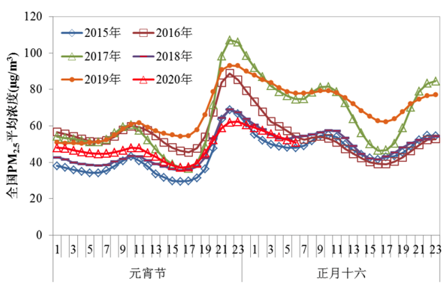 圖2近六年元宵節(jié)期間全國逐小時(shí)PM2.5平均濃度