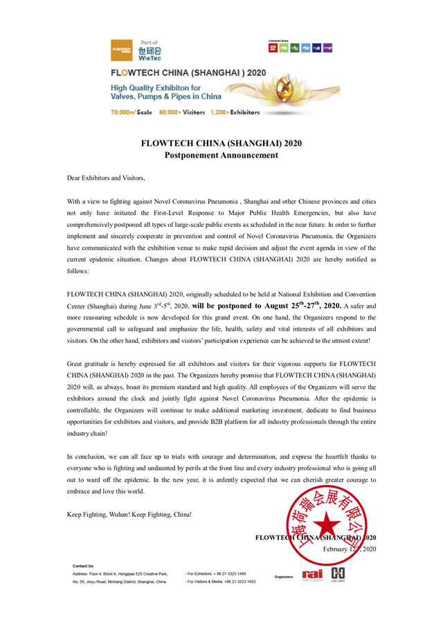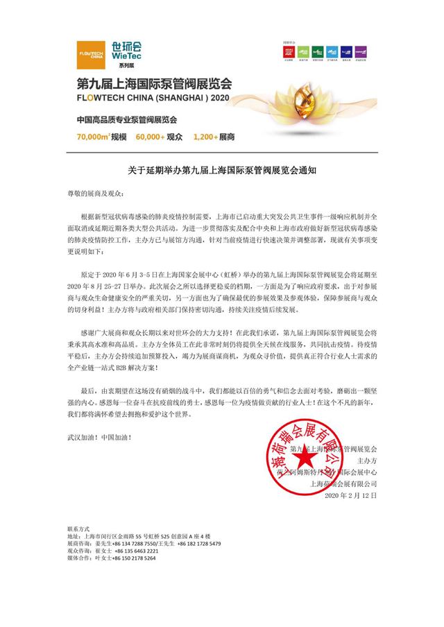 鑒于目前我國新型冠狀病毒感染肺炎疫情防治面臨嚴峻形勢,上海市已啟動重大突發(fā)公共衛(wèi)生事件一級響應機制,并全面取消或延期近期各類大型公共活動。 為避免人員聚集引發(fā)交叉感染,降低人群集聚可能造成的疫情傳播風險,保障所有展商、觀眾及參會人員的安全和健康,主辦方決定,將原定于2020年6月3-5日在上海國家會展中心(虹橋)舉辦的第九屆上海國際泵管閥展覽會將延期至2020年8月25-27日舉辦。