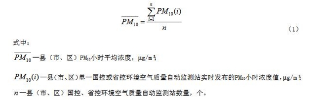 3.4縣(市、區(qū))PM10小時平均濃度hourlyaverageconcentrationofPM10atthey監(jiān)控點所屬縣(市、區(qū))全部國控、省控環(huán)境空氣質(zhì)量自動監(jiān)測站實時發(fā)布的PM10小時濃度的算術(shù)平均值。縣(市、區(qū))PM10小時平均濃度按式(1)計算: