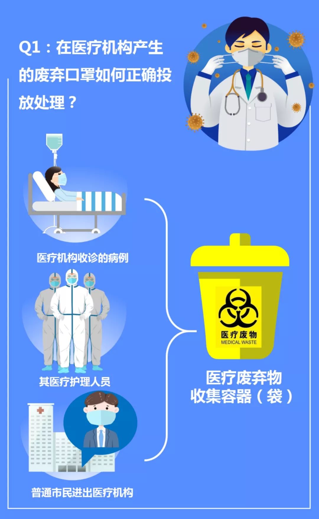 因日常工作或求醫(yī)問診等情況需要進出醫(yī)療機構(gòu)公共區(qū)域的普通市民,建議也將廢棄口罩投入醫(yī)療機構(gòu)設(shè)置的醫(yī)療廢棄物收集容器(袋)中,納入醫(yī)療廢棄物進行統(tǒng)一專項處置。