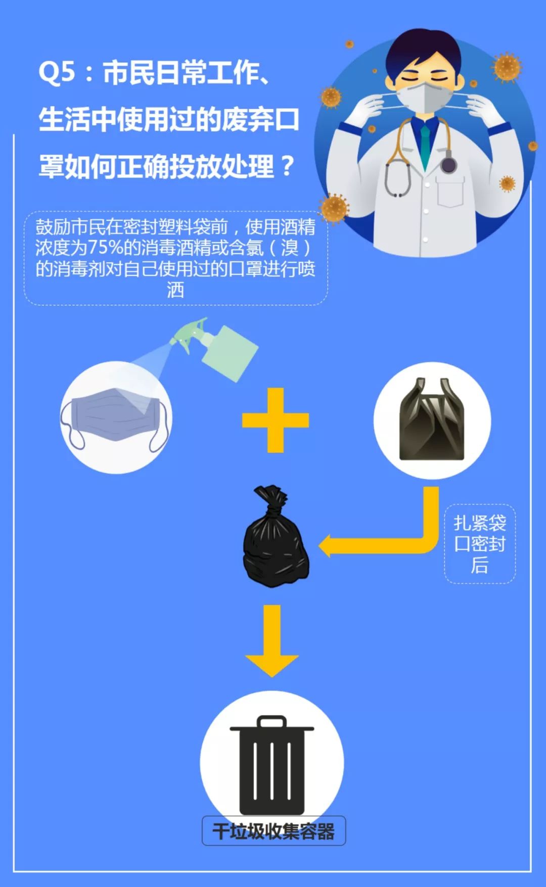 鼓勵市民在密封塑料袋前,使用酒精濃度為75%的消毒酒精或含氯(溴)的消毒劑對自己使用過的口罩進行噴灑,為后續(xù)極有可能會接觸、處理產(chǎn)生的廢棄物的工作人員,主動提供一份安全關(guān)懷保障。