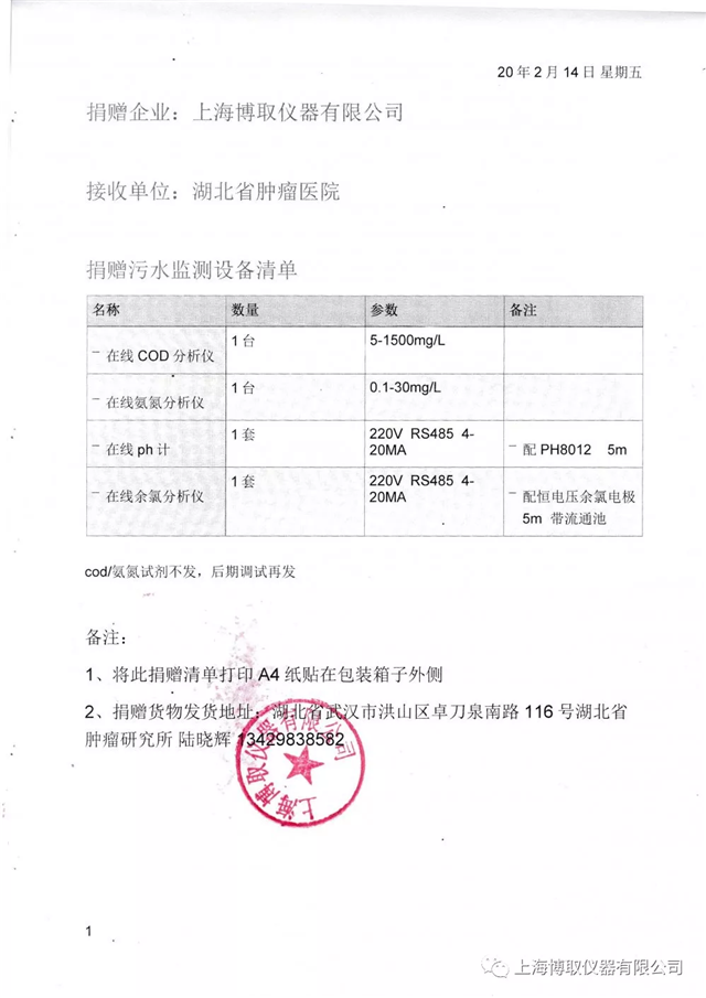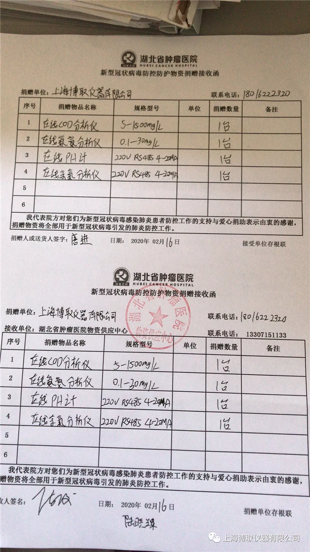 為更好地讓武漢當?shù)蒯t(yī)院救治更多的患者,確保疫情消滅成果,堅決打贏疫情防控阻擊戰(zhàn),上海博取儀器有限公司決定為湖北省腫瘤醫(yī)院捐贈一批水質(zhì)監(jiān)測儀器儀表,在線COD分析儀、在線氨氮分析儀、在線PH計、在線余氯,作為一個有社會責(zé)任感的企業(yè),上海博取儀器堅決跟隨國家腳步抗擊此次疫情,為了能讓武漢重見光明,也盡一份綿薄之力。