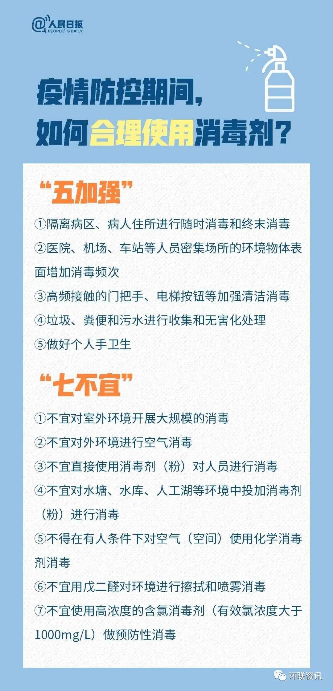 新型冠狀病毒肺炎疫情防控期間,應(yīng)合理使用消毒劑,遵循“五加強七不宜”,真正做到切斷傳播途徑,控制傳染病流行。“五加強”:隔離病區(qū)、病人住所進行隨時消毒和終末消毒;醫(yī)院、機場、車站等人員密集場所的環(huán)境物體表面增加消毒頻次;高頻接觸的門把手、電梯按鈕等加強清潔消毒;垃圾、糞便和污水進行收集和無害化處理;做好個人手衛(wèi)生。“七不宜”:不宜對室外環(huán)境開展大規(guī)模的消毒;不宜對外環(huán)境進行空氣消毒;不宜直接使用消毒劑(粉)對人員進行消毒;不宜對水塘、水庫、人工湖等環(huán)境中投加消毒劑(粉)進行消毒;不得在有人條件下對空氣(空間)使用化學(xué)消毒劑消毒;不宜用戊二醛對環(huán)境進行擦拭和噴霧消毒;不宜使用高濃度的含氯消毒劑(有效氯濃度大于1000mg/L)做預(yù)防性消毒。