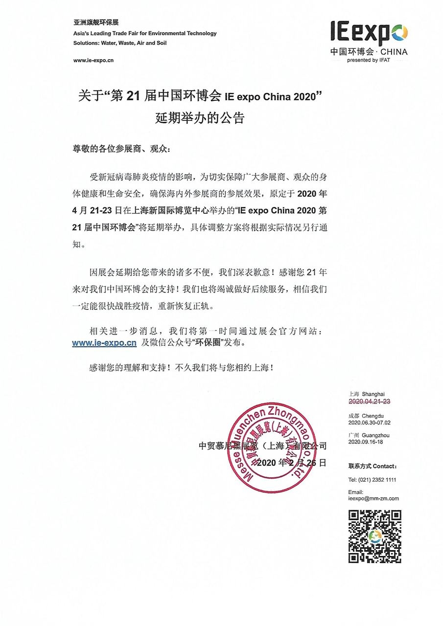 2月26日,中國環(huán)博會主辦方發(fā)布《關于“第21屆中國環(huán)博會IE expo China 2020”延期舉辦的公告》并宣布,原定于2020年4月21-23日于上海舉辦的第21屆中國環(huán)博會延期舉辦,“延期后的具體時間將另行通知”。
