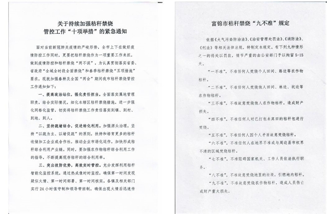 在此基礎(chǔ)上,2月23日,中共肇源縣委辦公室、肇源縣人民政府辦公室下發(fā)了《關(guān)于進(jìn)一步做好禁止秸稈露天焚燒工作的通知》,要求各鄉(xiāng)鎮(zhèn)(場)結(jié)合疫情防控工作人員安排,對三、四級網(wǎng)格人員變化情況重新報縣秸稈焚燒聯(lián)席會議辦公室備案;利用防疫工作建立的微信群、朋友圈、宣傳車等方式向社會公開秸稈露天禁燒的最新要求;強(qiáng)化巡查管控,做到各村屯、各地塊秸稈禁燒監(jiān)管不留死角、不留盲區(qū)、不留隱患;做到人防技防有機(jī)結(jié)合,繼續(xù)利用無人機(jī)、高清攝像頭等進(jìn)行火點(diǎn)監(jiān)控;對于管控措施落實(shí)不到位、出現(xiàn)著火點(diǎn)的,嚴(yán)格有關(guān)規(guī)定追責(zé)問責(zé);要求公安機(jī)關(guān)與各鄉(xiāng)鎮(zhèn)(場)積極配合,對露天焚燒秸稈行為進(jìn)行嚴(yán)厲打擊。