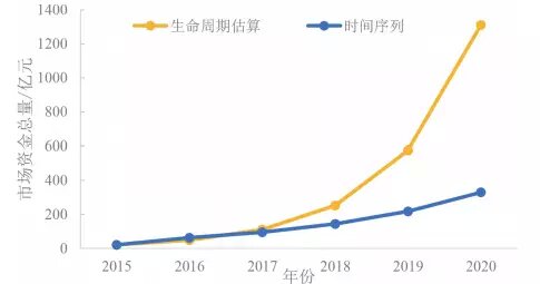 對(duì)于“十三五”期間土壤修復(fù)市場(chǎng)的預(yù)測(cè),利用生命周期估算和時(shí)間序列法進(jìn)行分析。根據(jù)生命周期估算法預(yù)測(cè)在整個(gè)“十三五”期間市場(chǎng)總額約為2297億元,是較為激進(jìn)樂觀的情況;根據(jù)利用時(shí)間序列法預(yù)測(cè)“十三五”期間市場(chǎng)總額約為849億元,是相對(duì)保守的情況,如圖5所示。