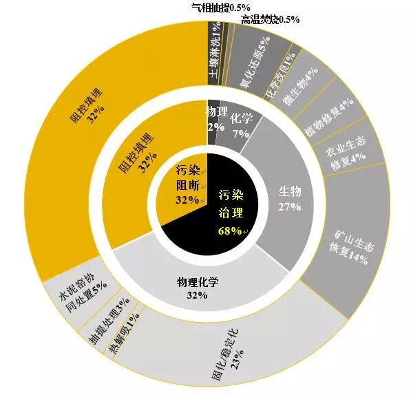 根據(jù)江蘇?。ㄒ伺d)環(huán)保產(chǎn)業(yè)技術(shù)研究院及土盟對(duì)公開招投標(biāo)項(xiàng)目的統(tǒng)計(jì)調(diào)查發(fā)現(xiàn),2008-2016年,我國177個(gè)土壤修復(fù)項(xiàng)目中,土壤修復(fù)以污染介質(zhì)治理技術(shù)為主,占比68%;污染途徑阻斷技術(shù)占比32%。在污染介質(zhì)治理技術(shù)中,物理化學(xué)和生物技術(shù)成為主要技術(shù),分別占比32%和27%;物理、化學(xué)單一類技術(shù)應(yīng)用占比相對(duì)較小,分別為2%和7%(圖 1)。