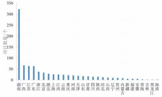 從目前所采集到的數(shù)據(jù)來看,已有29 個(gè)?。ㄗ灾螀^(qū)、直轄市)發(fā)布過土壤修復(fù)項(xiàng)目,如圖 4 所示。在發(fā)布項(xiàng)目的數(shù)量上,湖南、廣西、廣東、江蘇、浙江、北京各地較為領(lǐng)先,其中湖南省土壤修復(fù)項(xiàng)目數(shù)量居全國首位。
