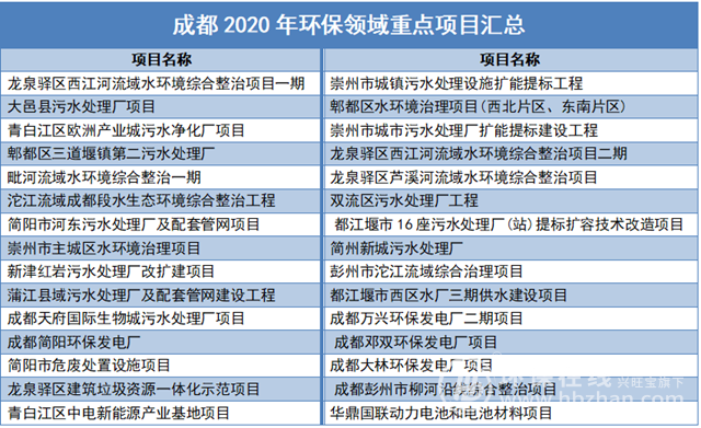 根據(jù)《成都市2020年重點(diǎn)項(xiàng)目計(jì)劃》可知,2020年,成都將實(shí)施1000個(gè)重點(diǎn)項(xiàng)目,總投資為33303.23億元。其中與生態(tài)環(huán)境有關(guān)的項(xiàng)目70余個(gè),總投資超2000億元,水處理項(xiàng)目相關(guān)的就有20多個(gè),除此之外,還有垃圾焚燒發(fā)電等環(huán)保項(xiàng)目,具體如下表: