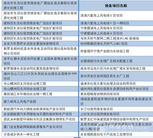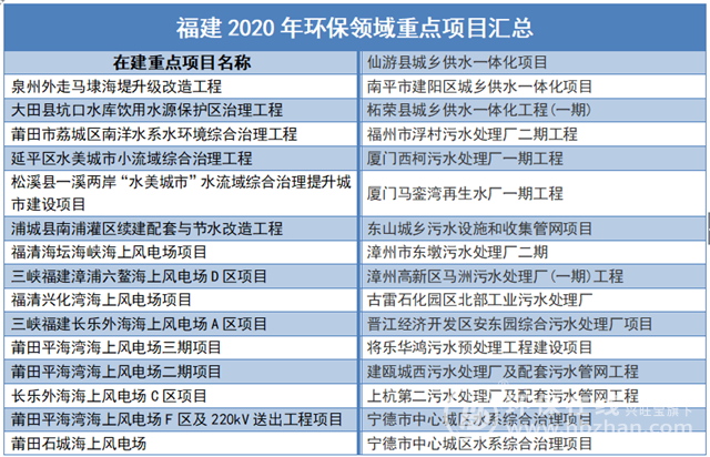 福建2020年將投資3.84萬(wàn)億元進(jìn)行重點(diǎn)項(xiàng)目建設(shè),共1576個(gè),分為在建項(xiàng)目和預(yù)備項(xiàng)目?jī)刹糠郑渲谐青l(xiāng)建設(shè)與生態(tài)環(huán)保項(xiàng)目近50個(gè),通過(guò)整理發(fā)現(xiàn)固廢處理、海上風(fēng)電和污水處理等項(xiàng)目居多,都有哪些環(huán)保項(xiàng)目呢?